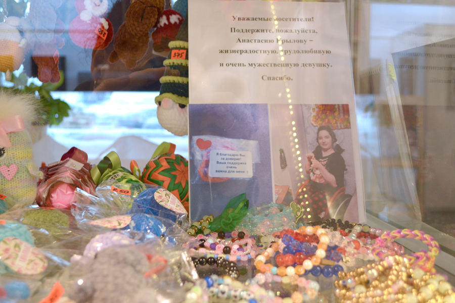 Мама Анастасии, Татьяна Дзюба, рассказала, что Настя работает, чтобы помочь семье: она плетет красивые фенечки, которые можно приобрести в сувенирной лавке музея по символической цене.