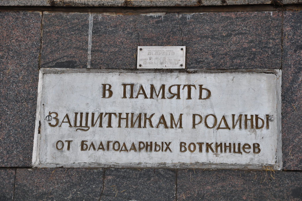 «В память защитникам Родины от благодарных воткинцев». Здесь же замурована капсула с посланием поколению XXI века для вскрытия ее в 2018 году.