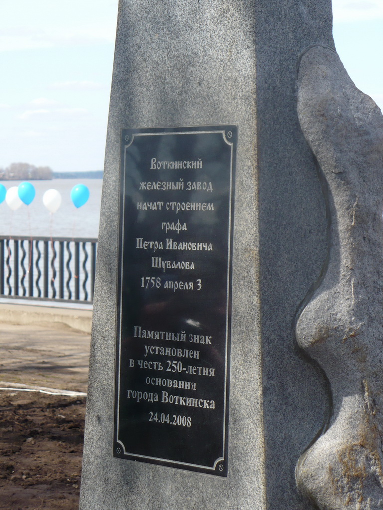 На камне из серого уральского гранита, обработанном в верхней части, прикреплена табличка с двумя надписями «Воткинский железный завод начат строением графа Петра Ивановича Шувалова 1785 апреля 3», «Памятный знак установлен в честь 250-летия основания города Воткинска. 24.04.2008».