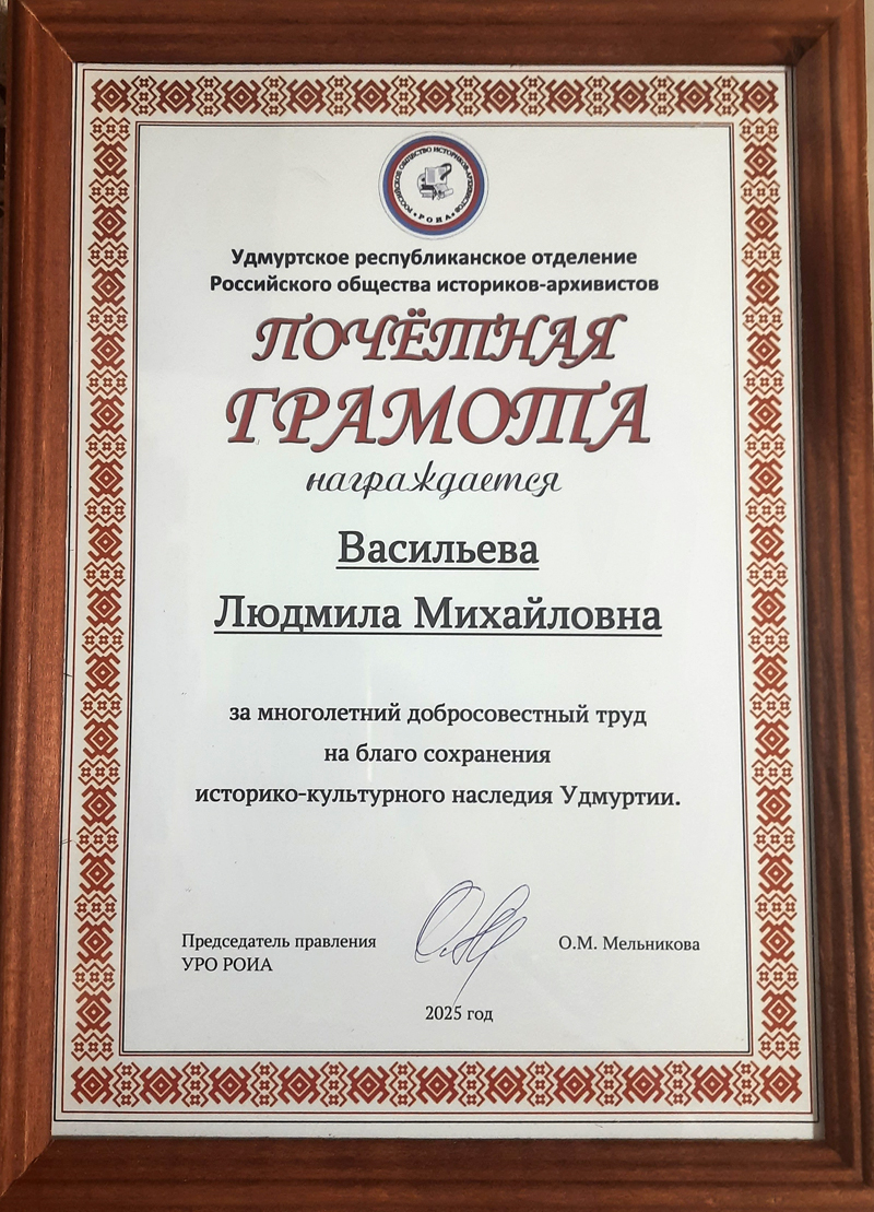 За многолетний и добросовестный труд на благо сохранения историко-культурного наследия Людмила Васильева была награждена Почетной грамотой Удмуртского республиканского отделения Российского общества историков-архивистов.