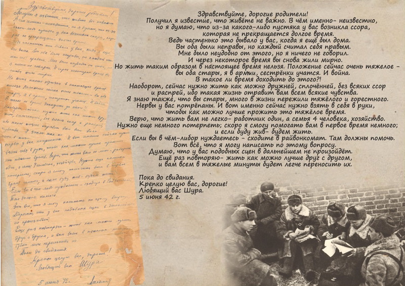 2015 год – особенный год в истории России, в судьбе каждого из нас, в этом году мы отмечаем 70-летнюю годовщину Великой Победы, это событие, значение которого не тускнеет от неумолимого бега времени. День Победы — светлый и яркий праздник, прежде всего, для ныне живущих фронтовиков и тружеников тыла, и для нас – наследников поколения победителей. Понятие «Победа» вмещает всё лучшее, что было и есть в судьбе России. В строках «…нет в России семьи такой, где б не памятен был свой герой» нет преувеличения. Каждого из нас хранит свою память о Великой Отечественной: у кого-то это ордена и медали деда или прадеда, ; кто-то трепетно хранит выцветшие от времени, хрупкие фронтовые фотографии, а у кого-то это фронтовые письма.